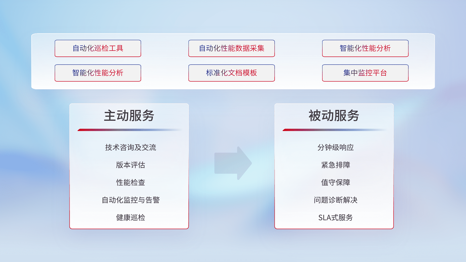 智能化工具和标准化文档,,,,保障服务质量,,,,提供主动服务(包含技术咨询、、、版本评估、、性能检查、、自动化监控与告警、、、健康巡检)和被动服务包含(分钟级响应、、紧急排障、、值守保障、、问题诊断解决、、、SLA服务)。。。