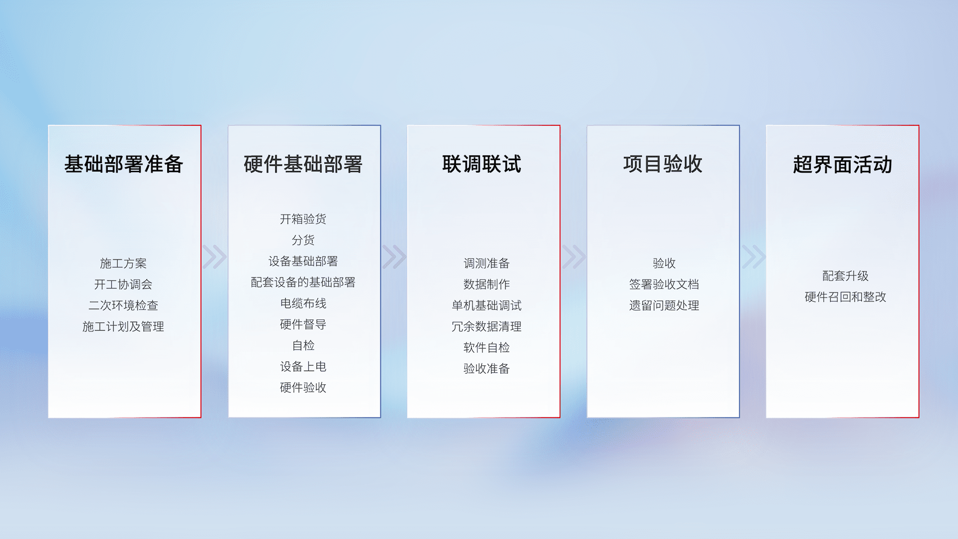 从基础部署准备、、、硬件基础部署、、、、联调联试、、、、项目验收、、越界面活动的全过程可追溯,,,,保证施工质量和进度。。。